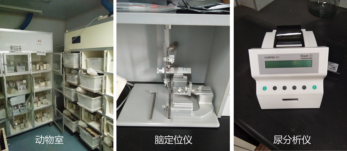 除常规饲养系统外,本平台还具有脑立体定位仪、尿分析仪、冰箱、天平、离心机等实验器材,可进行体重称量、药物灌饲、腹腔注射、组织样本取材、血清提取、药物血清制备、大鼠脑出血、缺血等动物模型制备等操作。